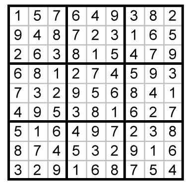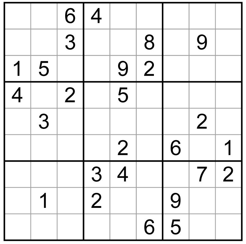 Fill in the blank spaces in the grid so that every vertical column, every horizontal row and every 3 by 3 box contains the numbers 1 through 9, without repeating any. There is really only one solution to each puzzle.