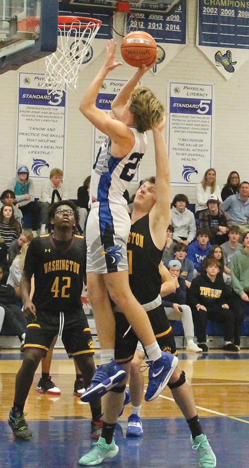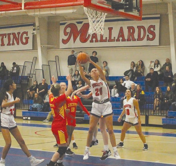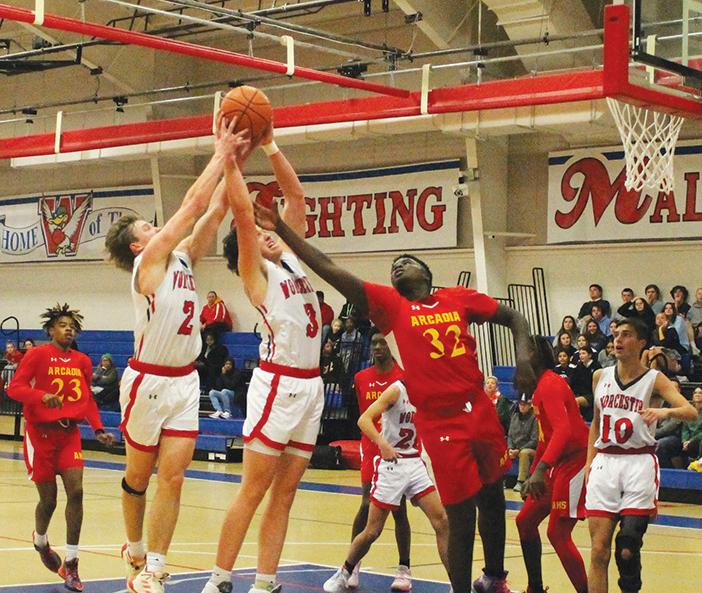 The Worcester Prep boys’ basketball team battled back and forth with Arcadia on Tuesday in Berlin, but lost, 51-49. (Left) Seni or Jack Gardner scores two of his team-high 20 points. He also had four rebounds and three assists. (Right) Seniors Griffin Jones (2) and JR Hamer fight for a rebound.