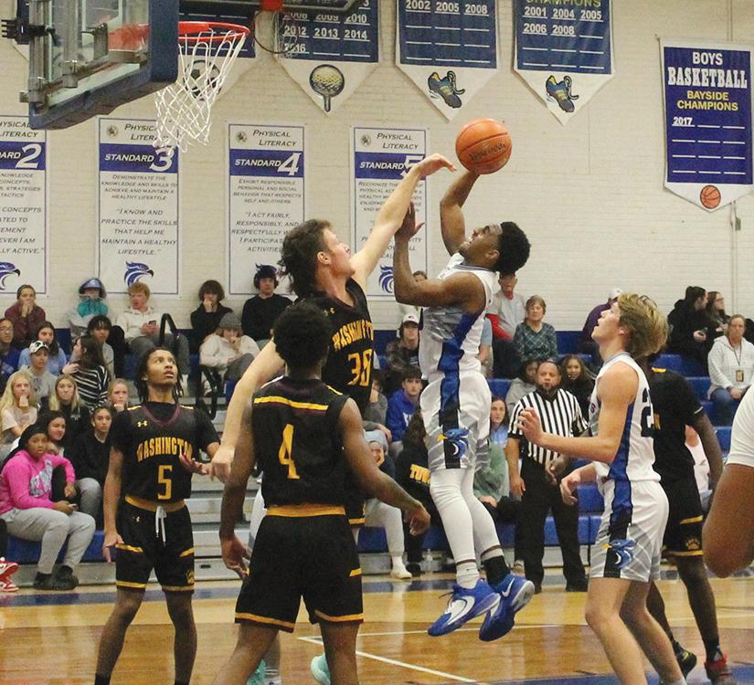 The Stephen Decatur boys’ basketball team battled, but lost 83-77 in overtime to Washington on Wednesday in Berlin. Decatur junior captain Brycen Coleman, left, scored 26 points and junior captain Jayden Hudson netted 28.