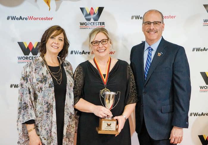 Faculty and staff members of Berlin Intermediate School were surprised to learn in October that the campus had been recognized as an Apple Distinguished School for its use of technology to enhance a student’s learning experience. Pictured, from left, are State Del. Wayne Hartman, Worcester County Board of Education President Elena McComas, Board Member Dr. Jon Andes, BIS Principal Dr. Amy Gallagher, BIS Teacher Michael Anne Bunting, Showell Principal Ryan Cowder, BIS Teacher Ellen Masters, Superintendent of Schools Louis Taylor, and Board Member Bill Gordy.