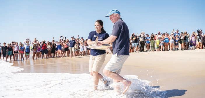 The National Aquarium released two Kemp’s ridley sea turtles, Bassoon and Cello, in August at Assateague State Park. This was the first public release since 2019. Pictured are Sen. Chris Van Hollen and Rehabilitation Manager Caitlin Bovery with Cello.