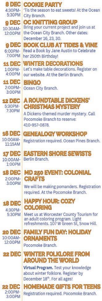 Worcester County Library - Ocean City Branch, 10003 Coastal Highway, Dec. 1 through Jan. 3. Stop by the Ocean City branch to admire the holiday magic and help complete a very special scavenger hunt. For families. 410-524-1818