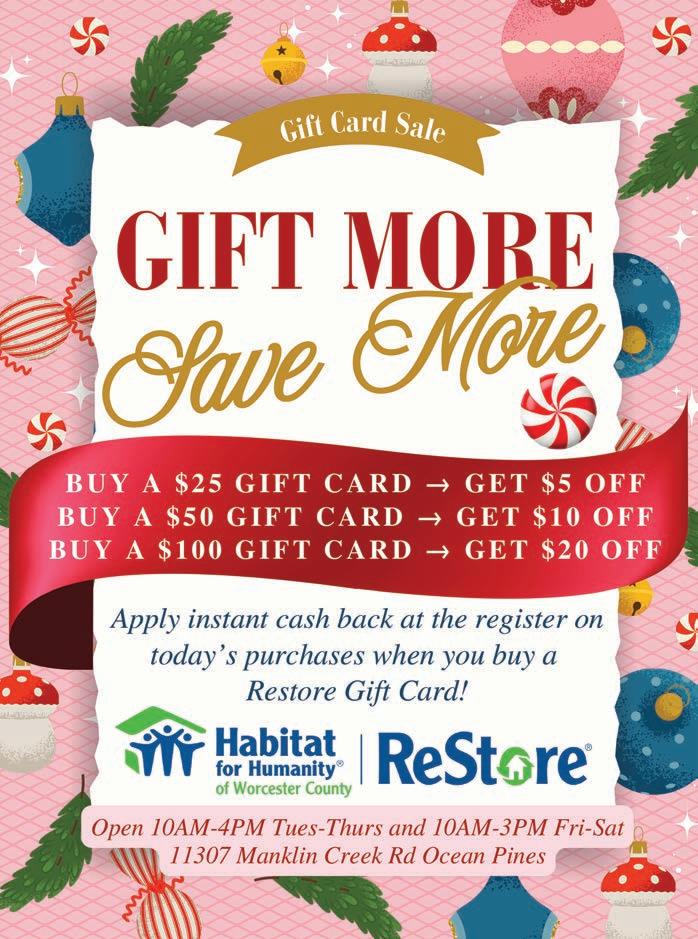 Select an item from Home Instead’s “Be A Santa To A Senior” Amazon wish list, purchase a gift card; or donate items such as warm clothing, blankets, crafts, puzzles and personal hygiene items. Drop off gifts to the Ocean Pines Community Center by Dec. 10. Gifts do not need to be wrapped. 410-641-7052, oceanpines.org