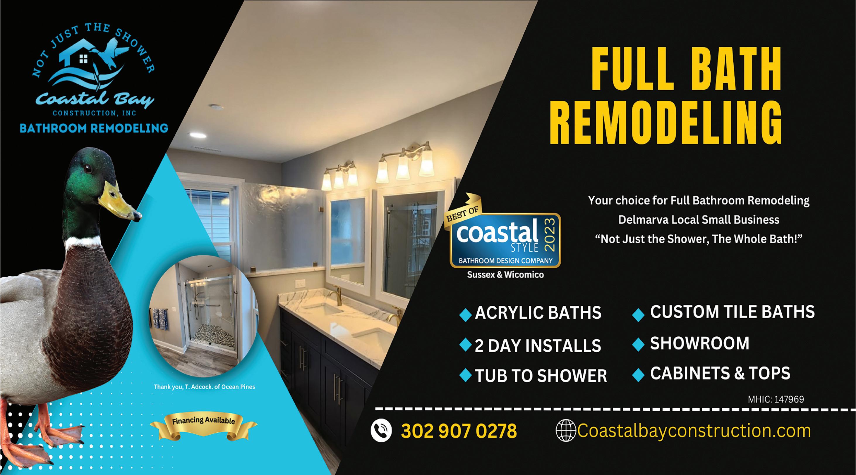 2024 Spring Home Guide PAGE 5 www.OceanPromotions.info HONESTY, DEPENDABILITY, PROFESSIONALISM, PRIDE, QUALITY All too often business will use words like these in order to gain the trust of their customers. We would like to elaborate... PHILOSOPHY We believe that strong ethical and moral principals are essential for the success and growth of any organization. You will realize this the minute you walk through our door. GOAL Our Goal is to provide you with the personalized service you deserve at a fair price. We will listen to your needs and tailor our services to meet them. INVITATION If you desire moral and ethical customer service, coupled with professionalism and quality, we encourage you to call on us! CALL TODAY to schedule your FREE Estimate Ocean Bay Plaza, Fenwick Island, De 1-800-298-9470 • 302-537-1899 mikesflooringanddesigncenter.com HOURS: Monday – Friday 9-5 Saturday 9-4 • Closed Sundays “We Measure Each Job With A Golden Rule” CUSTOM quartz countertops! CUSTOM kitchen cabinets! CUSTOM backsplashes! ARE YOU READY FOR THE SEASON? Is Ready For You! WE ARE YOUR ONE STOP SHOP! MIKE'S PROJECT MANAGERS ARE AT YOUR SERVICE! Mike’s Flooring & Design Center, FENWICK ISLAND DE. CUSTOM window treatments! IN STOCK 20 MIL WATERPROOF Luxury Vinyl Plank! HUGE SELECTION of Floor Coverings! Up To 24 Month 0% Financing e L iswhatyouneed integrity Honesty & eams! beach dr each your me to r Put your trust in tunning Custom Build s • a 4 BR/4.5 B Way a a ta 12327 Vist 11001 Manklin Meadows L REAL sandy dougan LTTOR® FOLLOW ME: 410.726.6557 Cell 410.208.3500 Office Contact me today! local knowledge! along with true LLC ane • Ocean Pines MD 21811 sandydouganrealtor edrealtysandyy.dougan@penf y..com r com is what you need A Member of the franchise system of BHH Affiliates, Shore Siding is locally owned and operated and has been providing professional home improvement services since 1989. CELBRATING OVER 35 YEARS! 410-629-1573 • www.shoresidingmd.com Licensed in MD, DE & VA Roofing & Siding Specialists Superior Home Improvement Services Superior $500 OFF ANY JOB OF $5,000 OR MORE EXP. 7/1/24 Call Today for a FREE ESTIMATE • Roofing • Flat & Metal • Siding • Windows • Gutters • Skylights & More ROOFING & SIDING