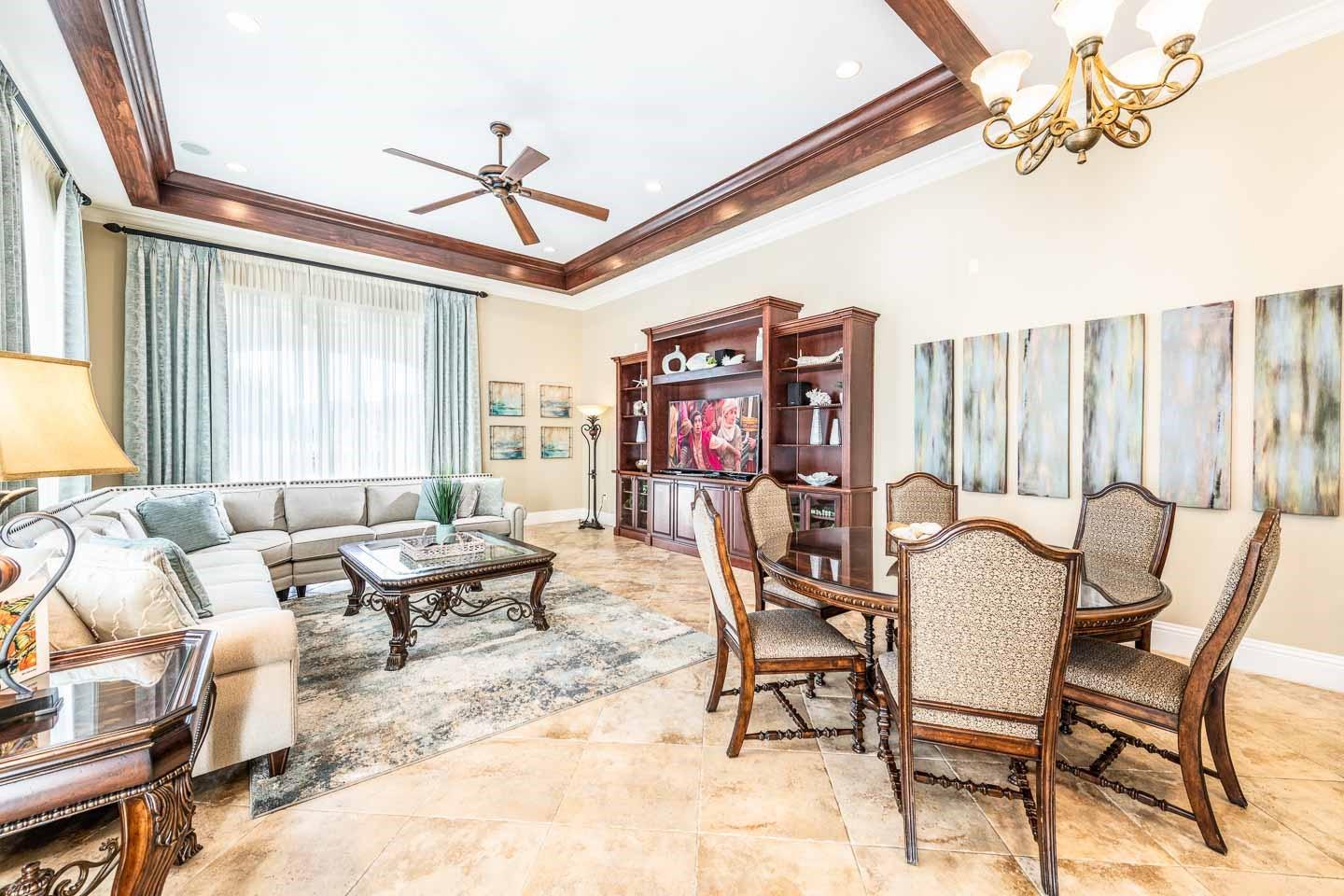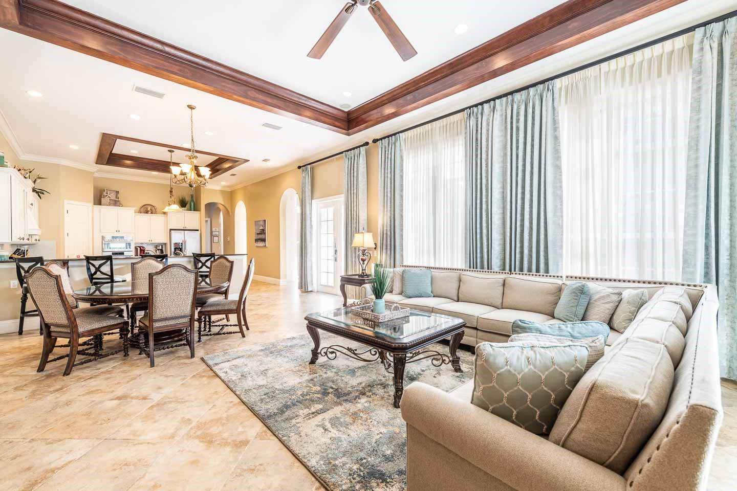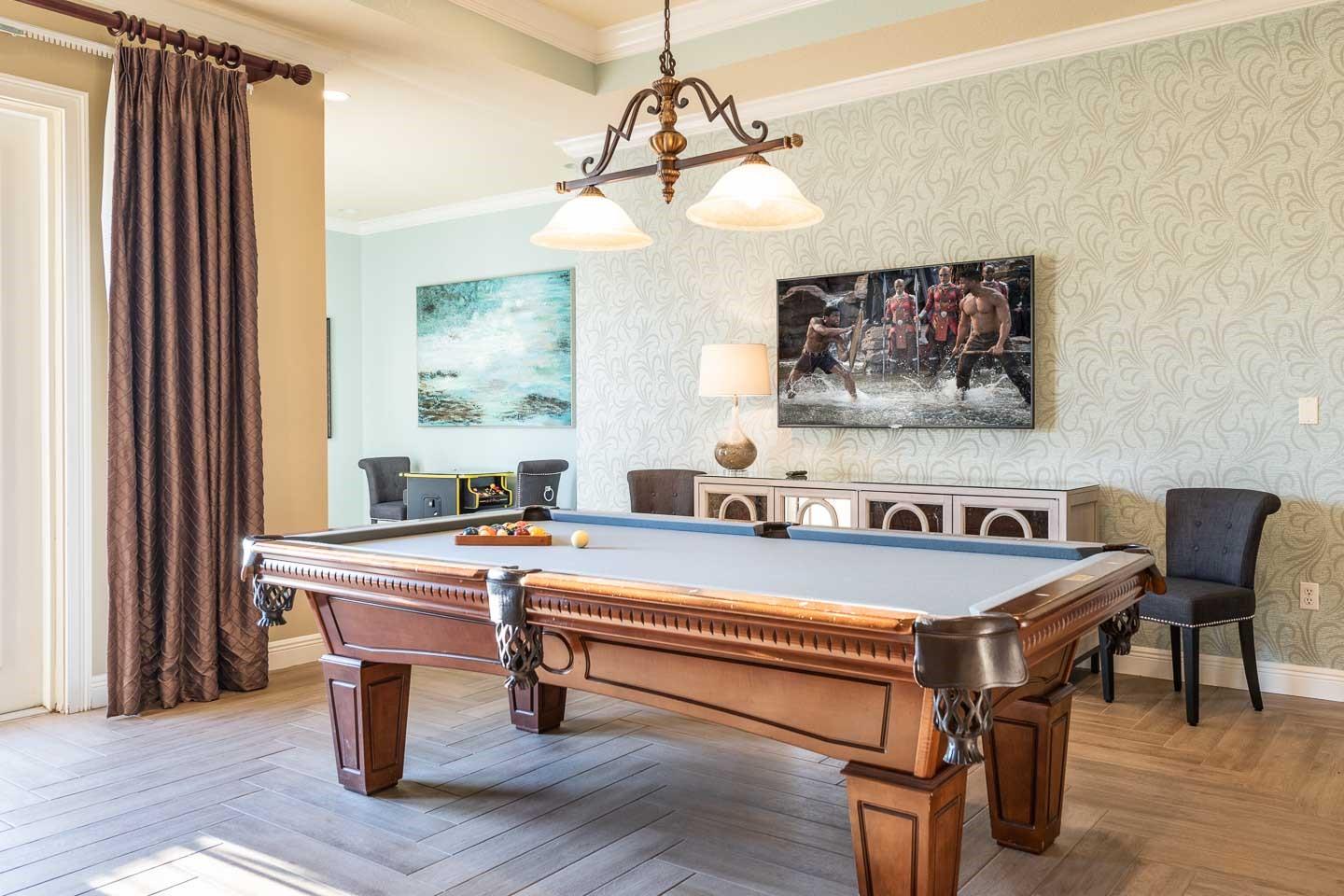 This grand villa certainly has the ‘ wow factor’. With style and opulence throughout, you'llfeellike a true VIP as you unwind poolside or kick-backin the private cinema room And ifthose spaces don't provide enough entertainment, head up to the loft area where you'llfind a pooltable, arcade machines, and even a game ofwall-mounted Scrabble. You're also just moments from the magic ofWalt Disney World, with the resort offering a free shuttle