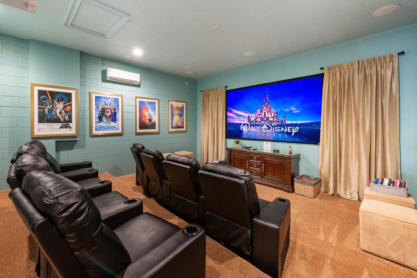 Private cinema room with 120" flat-screen TV and 8 leather recliner chairs