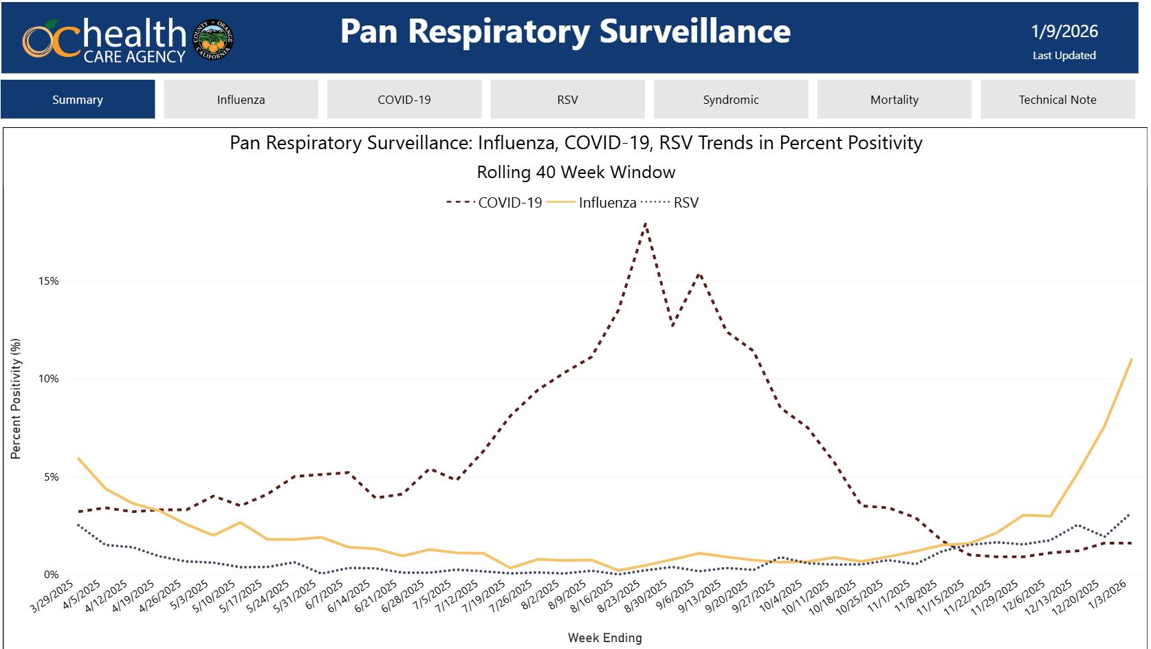 Orange County: Influenza activity remains elevated, although activity is not at the level it was last season at this time. Hospitalizations continue to increase. RSV test positivity and hospitalizations continue to rise. COVID- 19 percent positivity and hospitalizations remain low.