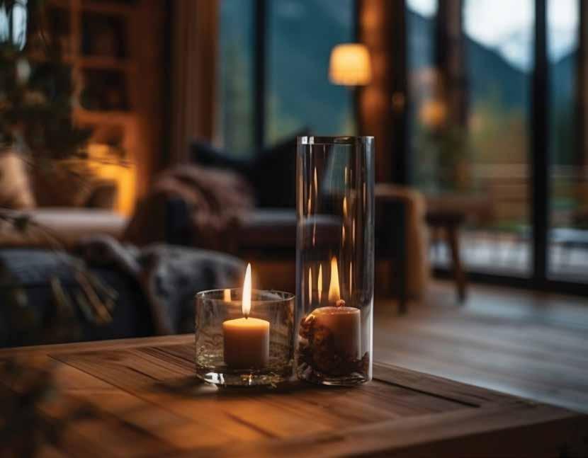 trabajar con distintas capas de luz. Lámparas de sobremesa, apliques y velas crean puntos de iluminación suaves que envuelven el espacio sin invadirlo. Las bombillas de tono cálido realzan los colores y aportan una luz favorecedora, mientras que las sombras añaden profundidad y misterio. La luz de las velas, en particular, conserva una capacidad atemporal para evocar romance.