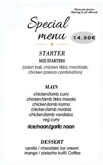SPECIAL MENU: Choice of starter, choice of curry, rice or naan, tea or coffee. Monday to Friday. 11,95€