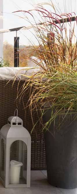 terracota con lavanda, romero o pequeños olivos evocan un aire mediterráneo, mientras que las plantas trepadoras como la hiedra o el jazmín suavizan paredes y barandillas. Incluso una sola planta bien elegida puede convertirse en el punto focal de un espacio pequeño. La iluminación suele pasarse por alto, pero puede transformar por completo el ambiente de un rincón exterior. Cuando cae la tarde, una luz suave mantiene el espacio acogedor. Faroles, luces solares o delicadas guirnaldas luminosas crean una atmósfera íntima y relajada. La luz de las velas, siempre utilizada con precaución, añade una sensación de calma difícil de igualar.