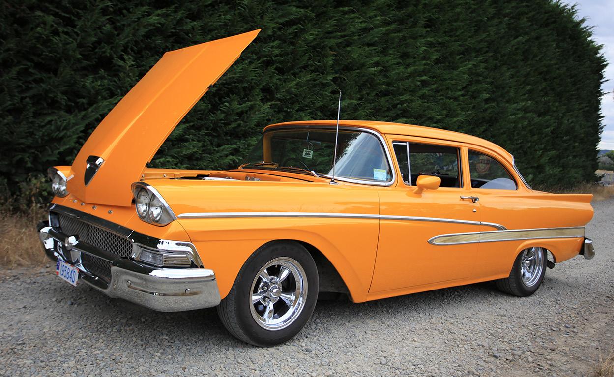 This classic 1958 Ford Custom here packs some serious Muscle Car goodies under that hood, yet it still retains its classy 58 factory appearance with the molded side trims and detailing that the cool era of wings had.