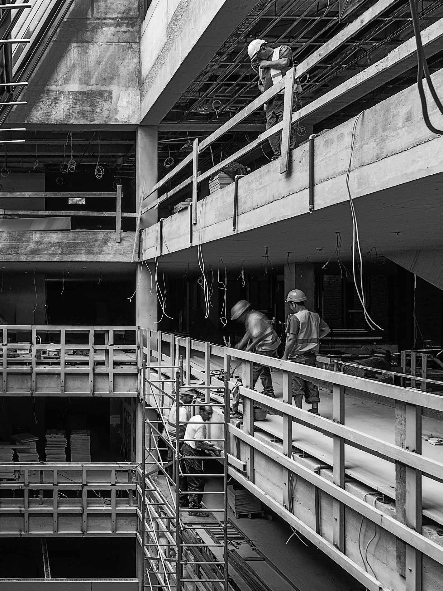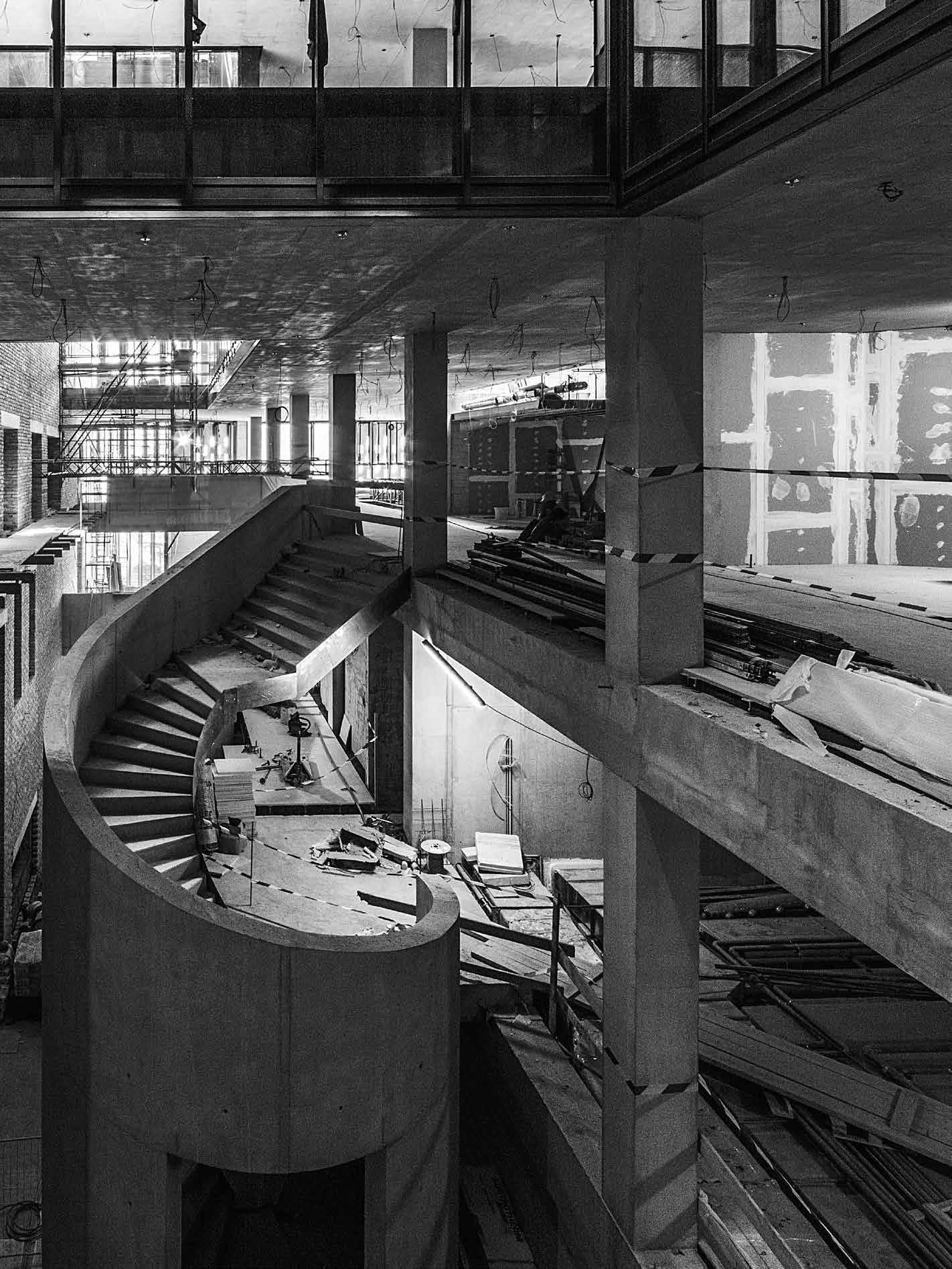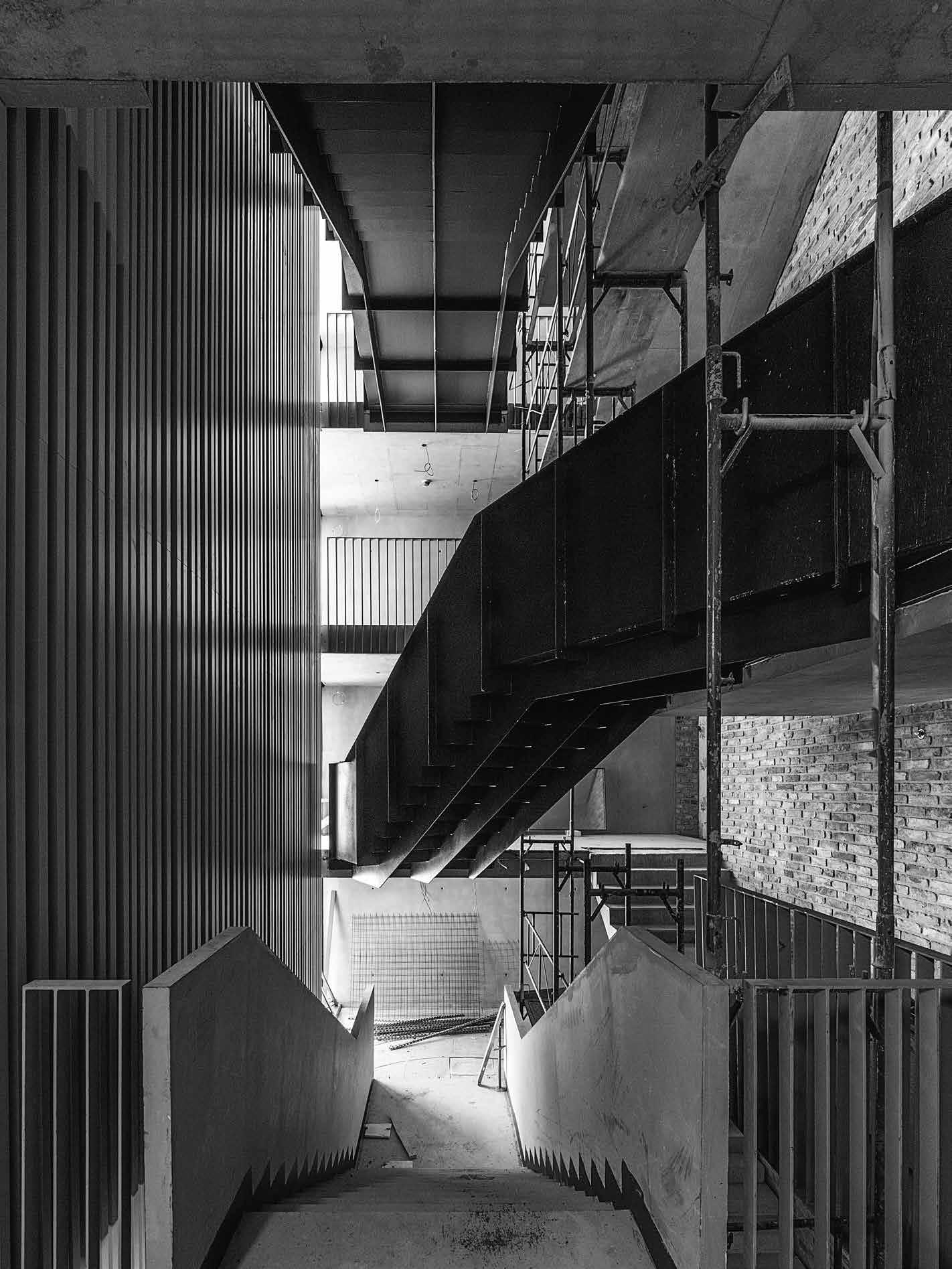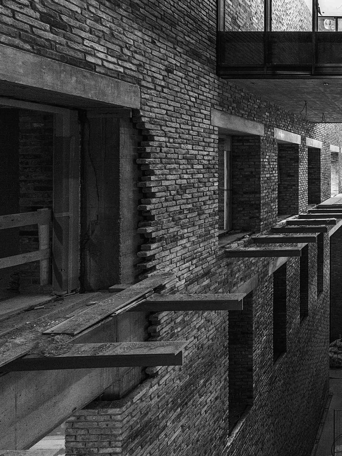 Úgy alakult, hogy az építkezés különféle fázisaiban szerkesztőségünk szinte minden munkatársa járt az CEU campus új Nádor utcai új épületében. Kézenfekvő volna megmerítkezni mindenben, amiből oldalak, szövegek, képek születnek, ugyanakkor ritka kegyelmi állapot, amikor a napi munkából kiszakít az élmény. Kollektív tudásunk, tapasztalatunk lett szép lassan egy épületről, amiben külön-külön, de órákat töltöttünk el. Hol poros, koszos munkálatok közben, hol a tervezőket hallgatva bolyonghattunk útvesztőnek tűnő bejárásokon, építőanyaghalmok, építőgépek között az épületben. Az építés utolsó hónapjai voltak ezek. Feltűnően, korábbi tapasztalatainkat felülíró módon sok építőmunkás serénykedett az épületen. Hatalmas tömegnek tűnt szűk helyen, miközben még teherliftek, állványerdők szőtték át az épület belső tereit. Valami különös életerő lüktetései voltak ezek. Ritkán lehet megtapasztalni a születést ebben az érzéki formában az építészet kapcsán. Nekünk, kívülállóknak, akik nem érintkeztünk a kivitelezés, szervezés, lebonyolítás napi küzdelmeivel, apró győzelmeivel és kudarcaival, ez a megszületés előtti állapot leginkább egyfajta energiaként, sodró lendületű áradásként volt megtapasztalható. Élményeink, látogatásaink után ebből az energiából vittünk a szerkesztőségbe magunkkal valamit, amivel képesek voltunk a többiek érdeklődését is felkelteni azzal kapcsolatban, hogy valami rendkívüli formálódik az épület utcai kőhomlokzata mögött. Valószínűleg a CEU campus tervezőinek alkotói módszere kapcsán elhangzott „kézműves” foga-