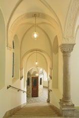 A poligon-udvart lefedő üvegtető körül a kerengő oldalfalának burkolata új gyártású Zsolnay-kerámiából készült.