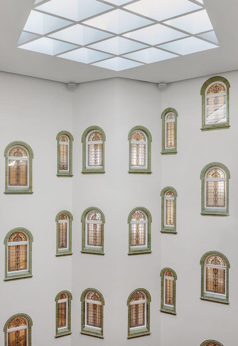 A két belső udvar közül a nagyobbikat félköríves árkádos folyosók veszik körül, a lépcsőház felé nyíló színes, madár- és virágmintás, egyedi üvegablakait élénkzöld mázas kerámiafoglalat emeli ki, itt a szecesszió Lechner-féle magyaros motívumvilágával és színeivel találkozunk.