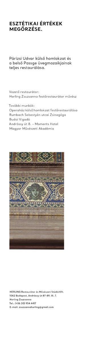 redetibbnek. A belső térben található kristálykupola burkolatát egy időben elbontották, így a passzázs további szakaszainak burkolata alapján lett rekonstruálva, újragyártva. Ugyanazt a motívumrendszert követtük, ami adott volt. Ugyanez a homlokzatra is igaz. A formailag és alakilag helyes burkolóelemek alapján gyárttattuk újra a hiányzó vagy rossz állapotú elemeket. A restaurátori munkák során is történtek bontások, amikor rossz állapotú, vagy környezetükbe nagyon nem illő újabb kori pótlásokat, újragyártásokat kellett eltávolítani. Ugyanakkor minden bontást megelőzően mérlegelni kellett, milyen károkozással járnak a bontási munkák. Az ilyen díszítő elemek újratervezéséről tehát nem volt szó, viszont az ezekhez szükséges tartó- és segédszerkezeti megerősítés és helyreállítás jelentős tervezési és kivitelezési munkatöbbletet eredményezett. A 1960’70-es években a passzázsba két telefonszekrényt is beállítottak, ezek – felújítás után –, új funkcióval, ismét helyet kaptak az épületben.