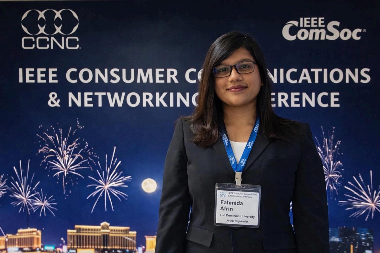 CSICS graduate student Fahmida Afrin had a wonderful experience attending the IEEE Consumer Communications & Networking Conference 2026, where she had the opportunity to present her research paper, "Multi-scale Graph Neural Network for Low-SNR Wireless Signal Classification," and engage with a vibrant community of researchers and practitioners. Discussing her work was especially rewarding, as it prompted thoughtful questions, constructive feedback, and valuable insights that helped her gain new perspectives on her research.