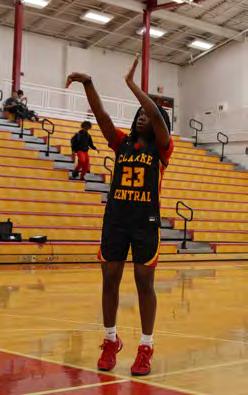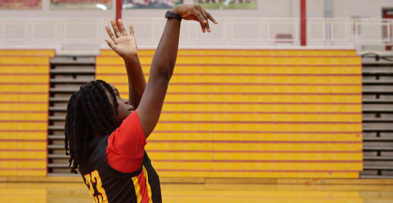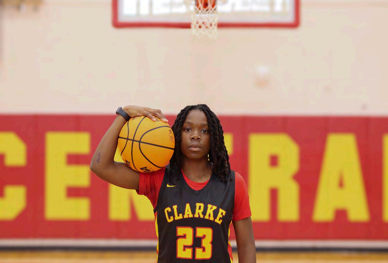 Below: DOUBLE DOUBLE: Clarke Central High School girls varsity basketball point guard De’Anah Oliney, a sophomore, takes a shot in the CCHS Competition Gym. Oliney played on the CCHS varsity girls basketball team in the 2024-25 season, despite it being the first time ever playing the sport. “In basketball, my proudest moment is the first time I hit a double-double. I had the most double-doubles on the team. That was as a freshman, and I had at least three or four double-doubles. I was proud of myself,” Oliney said. “At the beginning of the season, I didn't even know what a double-double was. They had to explain it to me, because I never played basketball (before).”