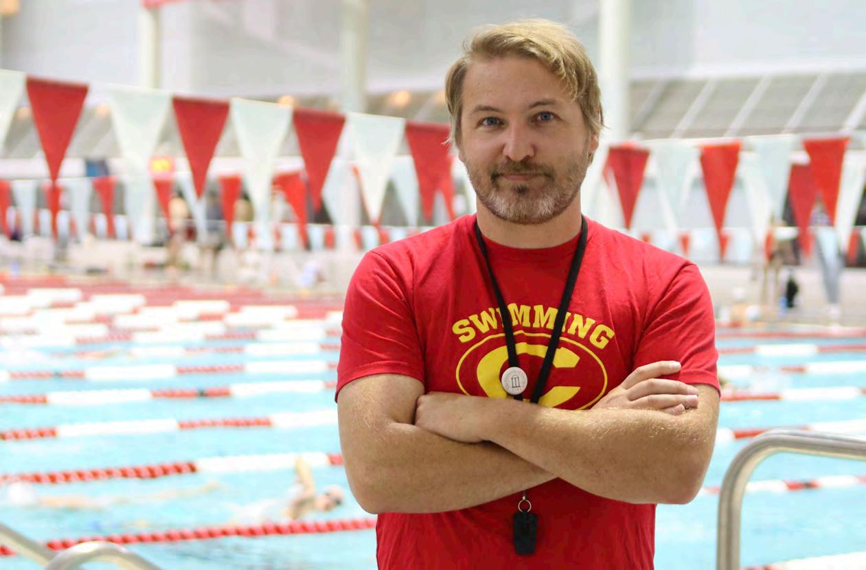 Above: A NEW START: Clarke Central High School head varsity swim and dive coach Rick Simonds poses at the University of Georgia Ramsey Student Center on Oct. 15. Simonds, a CCHS Class of 2003 alumnus, has returned to the Clarke County School District for the 2025-26 school year to teach eighth-grade Georgia Studies at Burney-Harris-Lyons Middle School and coach at CCHS. “I miss being around the water. I miss being around the pool, the kids, teaching them (and) coaching,” Simonds said. “I was very fortunate that when I got the job at BHL, (I) happened to see that there was a position and sort of right time, right place. (I) couldn’t be happier that I’m back (in the) Clarke County and helping out with my old high school.” Photo by Kye Streetman