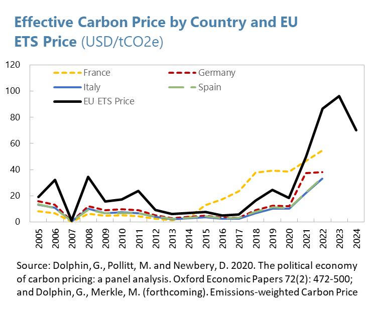 • Effective carbon price of ca. 40 Eur/tCO2e at end-2021 in the euro area (own calculations, data on price and coverage from the World Bank and European Commission)