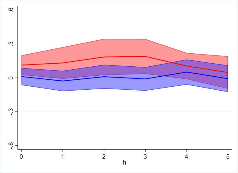 • France: No effect initially, difference of about 1 pp after 5 years.