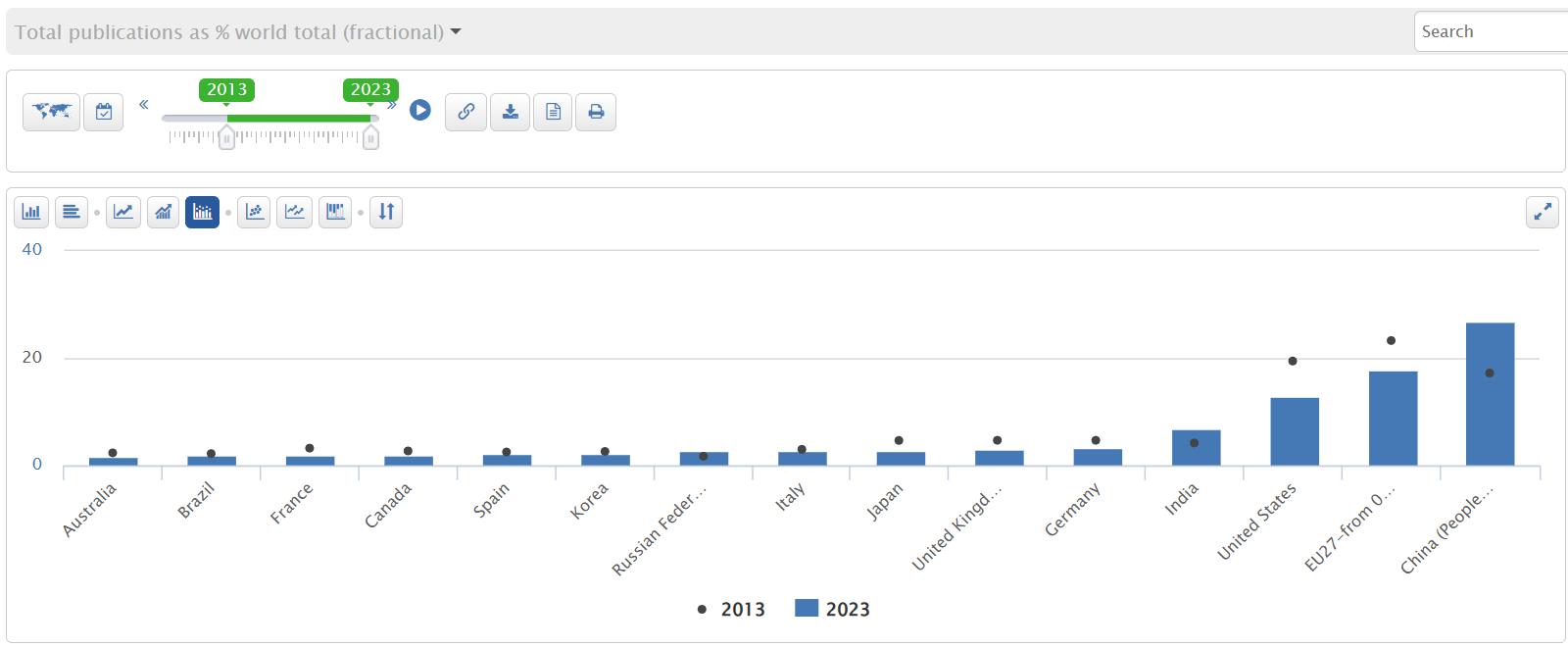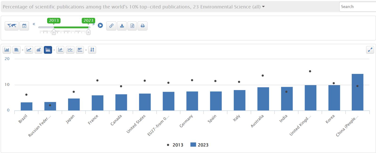 – Documents among global 10% most-cited in their category (domestic share and contribution to global 10% most-cited)