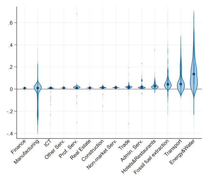 Note: The figure shows the distribution of percent predicted changes in loan spreads (using the baseline regression results shown in Table 3, column 5) from increasing the carbon tax index by one unit (around 10 EUR/tCO2). The blue dots represent the median predicted change in firms’ loan spreads within each industry. Differences across and within industries are driven by the variation in deal- and firm-level characteristics (including environmental performance).