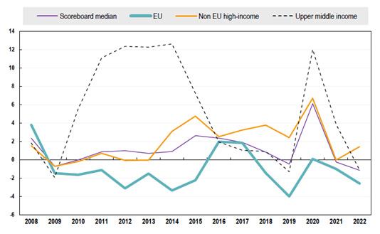 Median growth rate of outstanding loans to SMEs by country group