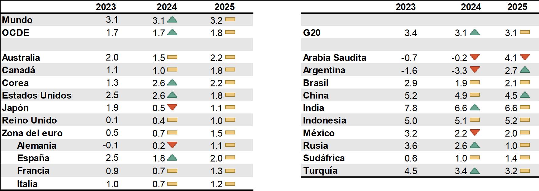 Nota: Las proyecciones de la India se basan en los ejercicios fiscales, que comienzan en abril. La Unión Europea es miembro de pleno derecho del G20, pero el cómputo global del G20 solo incluye a los países que también son miembros por derecho propio. España es un invitado permanente del G20. Los agregados mundiales y del G20 utilizan ponderaciones del PIB nominal móvil a paridades de poder adquisitivo. Los símbolos indican la magnitud de la revisión con respecto a Perspectivas Económicas 114. Las flechas rojas indican una revisión a la baja de al menos 0,3 puntos porcentuales. Las flechas verdes indican una revisión al alza de al menos 0,3 puntos porcentuales. Fuente: Base de datos de Perspectivas Económicas 115 de la OCDE; Base de datos de Perspectivas Económicas 114 de la OCDE; cálculos de la OCDE.