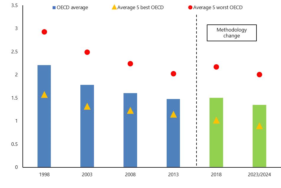 Note: The averages include all OECD countries that are currently members of the OECD The results are very similar if only the countries that were members of the Organisation in each specific year are considered. A change in methodology in 2018 implies that only trends can be compared.