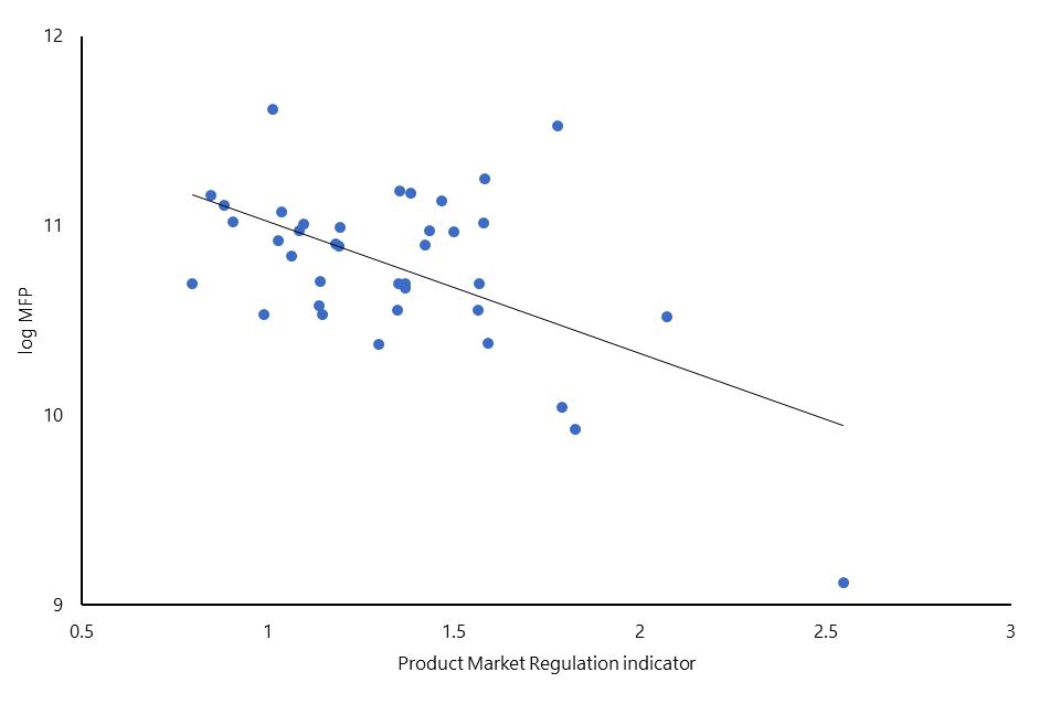 There is much scope for product market reforms to rekindle productivity via innovation-led growth. Indeed, multi-factor productivity – which measures the ability of countries to produce more output with a given bundle of capital and labour – tends to be higher in countries with less stringent PMR (Figure 3). This negative correlation, corroborated by econometric analysis, reflects the idea that more competitive product markets tend to encourage innovation and the rapid diffusion of leading technologies by reducing barriers to the entry and growth of new innovative businesses (Andrews, Criscuolo and Gal, 2016). In the face of competition, incumbents are forced to improve their products and services, production processes, and management practices. The corollary is that in more competitive product markets, less productive firms will face higher pressure to downsize or exit, which will release scarce resources and permit the growth of more productive and innovative firms.
