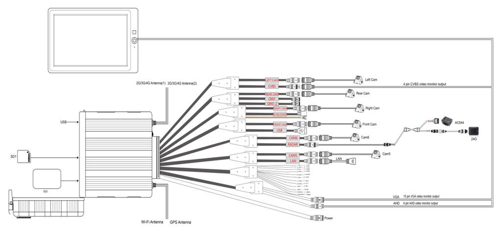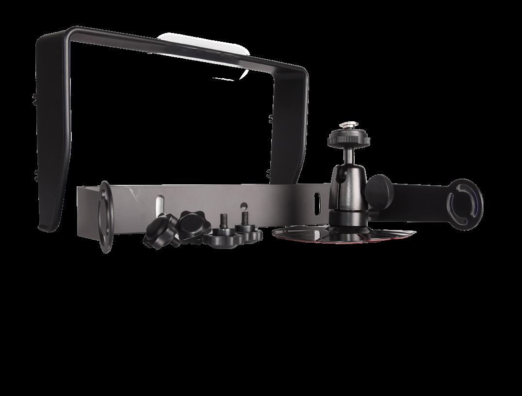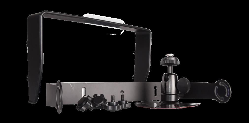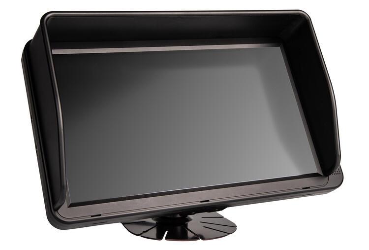 Näytön mukana tulee kannatin, häikäisysuoja, näytön kaukosäätö sekä kamera kaapeli. Kamerat voidaan ohjata päälle triggereiden avulla sekä näytönjako voidaan toteuttaa trigerillä. esim peruutustilanteessa, jolloin näyttö jaetaan etukameran ja peruutuskameran kuvien kesken.