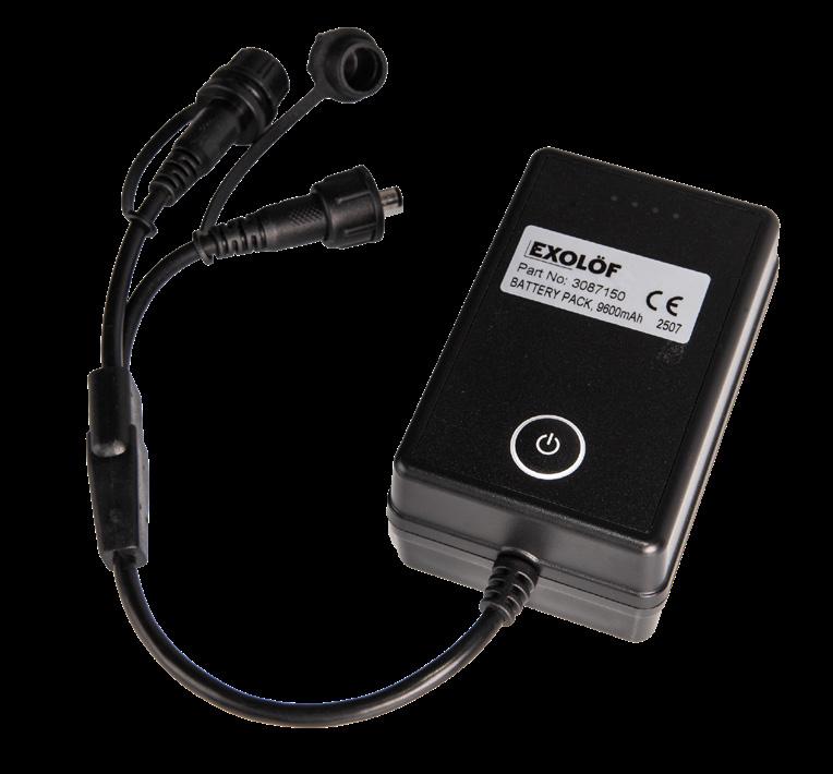 Exolöf-akkupaketti langattomiin kameroihin, 9600 mA. Akku ladataan mukana tulevalla USB-laturilla. Akun uudelleenlataus kestää noin 3 tuntia (12 V tai 24 V DC).