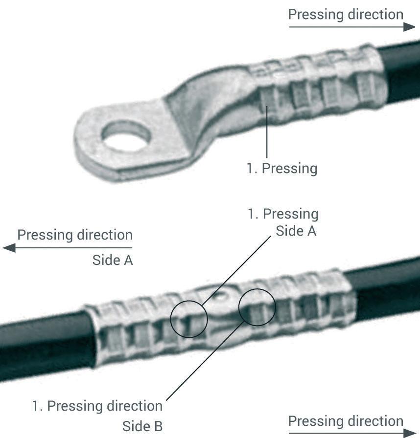 Pressriktningen för kabelskor och kontakter kan ses i den intilliggande skissen.