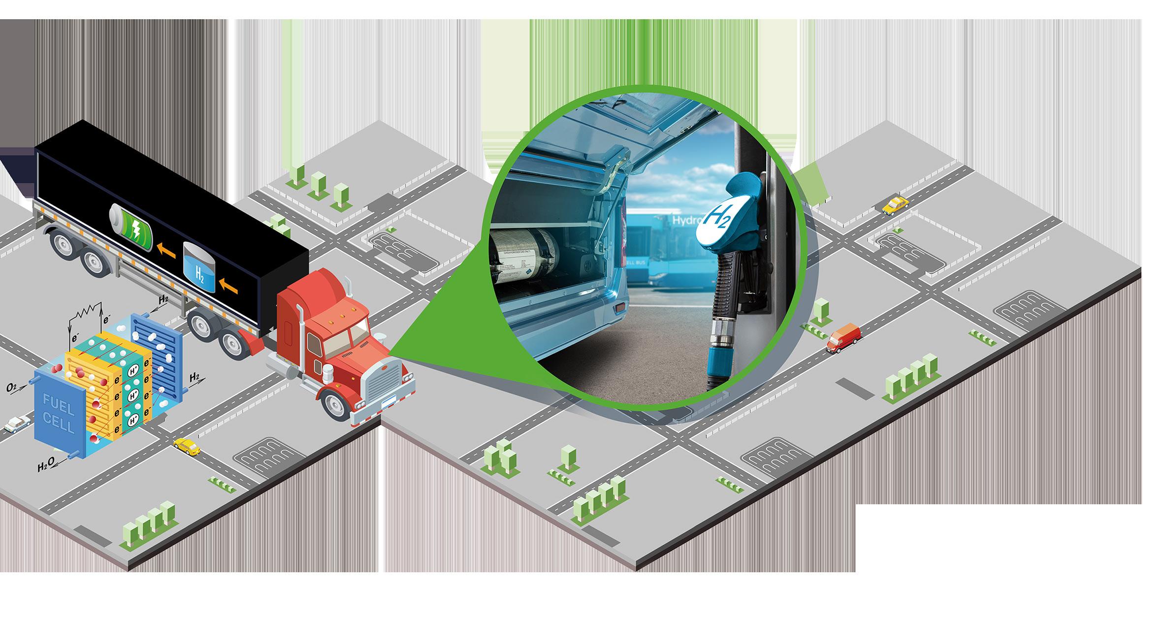 V těchto případech použití uvolňují vysokotlaké zásobníky vodíku do systému palivových článků vodík podle potřeby energie. Vozidla poháněná vodíkem mohou buď tankovat na čerpacích stanicích, nebo se jejich zásobníky naplní a později se zapojí do stacionárních energetických systémů.
