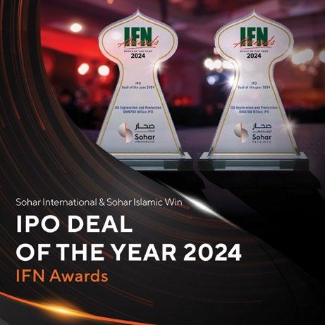 that contribute to the broader pursuit of financial excellence and investor empowerment.” As the Issue Manager of Oman’s largestever Initial Public Offering (IPO), Sohar International played a pivotal role in structuring and executing a transaction that raised a record RO780mn, setting a new benchmark for capital market excellence. This landmark IPO not only attracted overwhelming investor interest but also served as a catalyst for advancing Oman’s regulatory framework, aligning capital market mechanisms with international best practices.