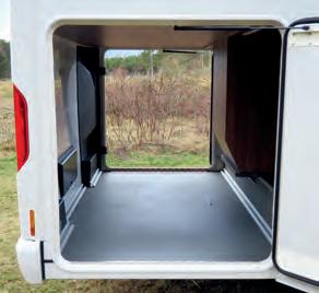 hochgeklappt werden, wodurch eine großzügige Durchlademöglichkeit entsteht. Der Staubereich kann mittels zwei Klappen vom Wohnraum abgeteilt werden. Überrascht haben uns die zahlreichen Stauräume. Sogar der Raum unter dem Tisch kann durch eine Lade genutzt werden. Viele LED-Beleuchtungskörper mit Touchschalter erzeugen eine schöne Lichtstimmung. Die Trittstufe ist elektrisch bedienbar. Wenig praktisch finden wir den Zugang zur Elf-Kilogramm-Gasflasche, die unter dem Bett nur sehr schwer erreichbar ist. Durch die Truma-Dieselheizung, die auch das Warmwasser aufbereitet, ist es zum Glück nicht nötig, sie oft zu wechseln. Steckdosen sind gut im ganzen Mobil verteilt. Alle Fenster, die Eingangsschiebetür und auch die Hecktüren sind mit einem Fliegengitter und Verdunkelungsrollos ausgestattet. Im hier vorgestellten Fahrzeug befindet sich auch eine Klimaanlage, eine Markise und ein Radträger für zwei Räder.