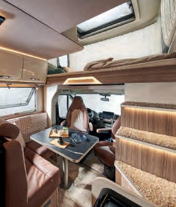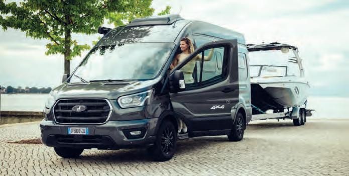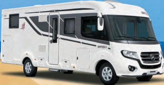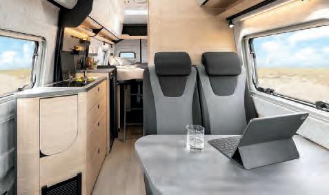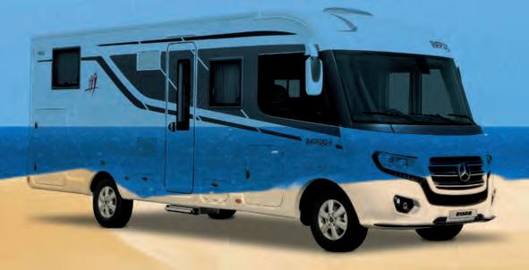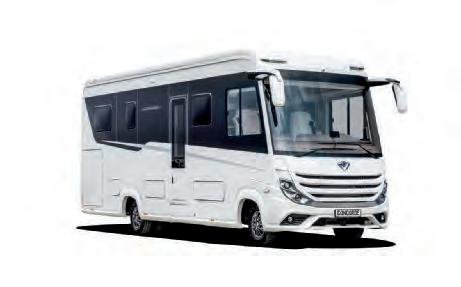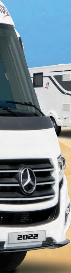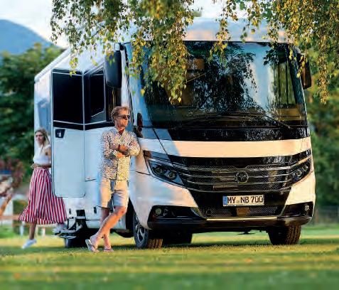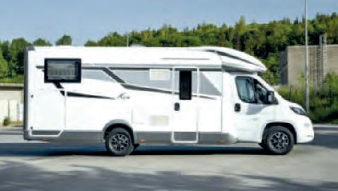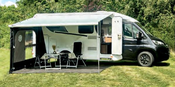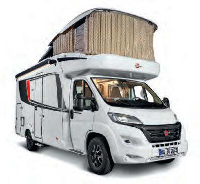 Alle sechs Ausstellfenster sind getönt. Verdunkelungsrollos und eine doppelte IsolierAcrylverglasung sind ebenso wie das Einschlüssel-System in der Serienausstattung integriert. Stabile Rangiergriffe an Bug und Heck erleichtern das Handling. Der Bugkasten hat eine niedrige Beladekante. Außerdem bietet er zusätzlichen Stauraum, da ja keine Gasflaschen benötigt werden. Die Bugklappe aus Kunststoff ist mit Parallelogramm und Aufstellmechanik ausge-