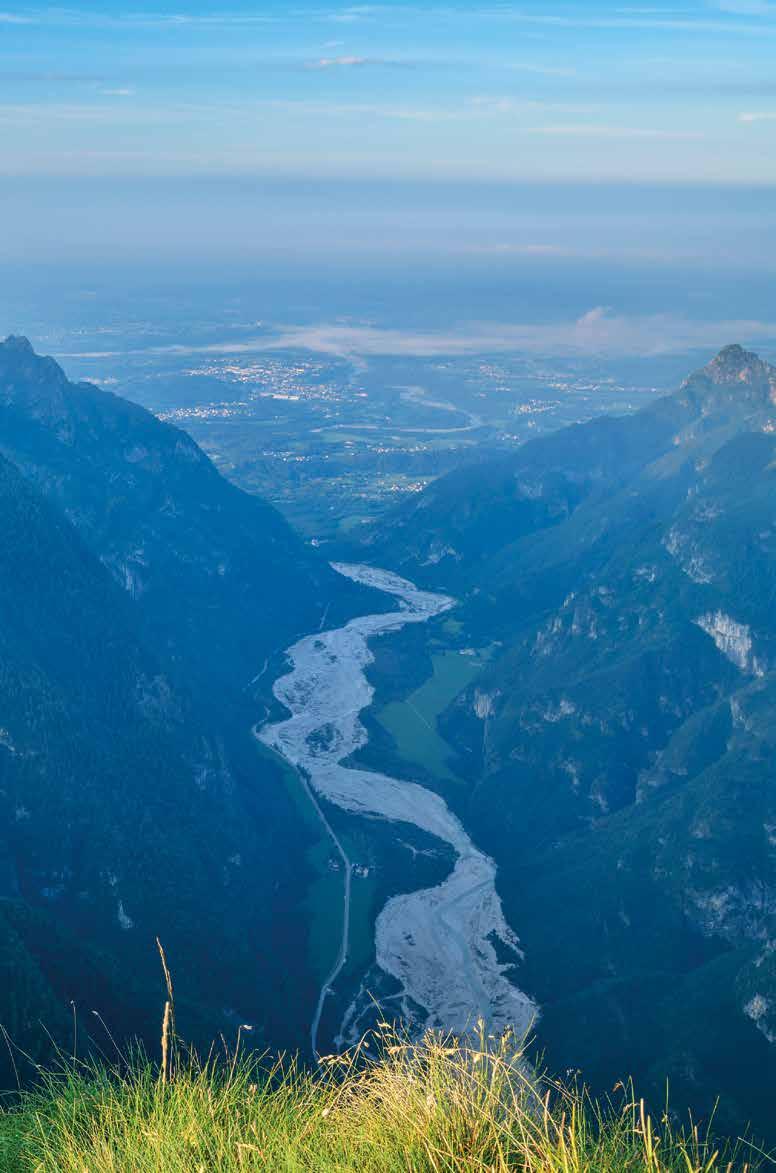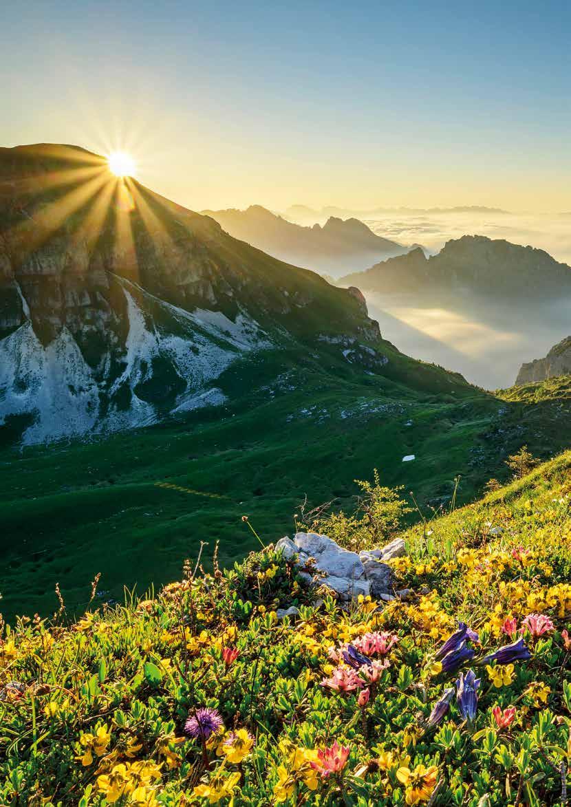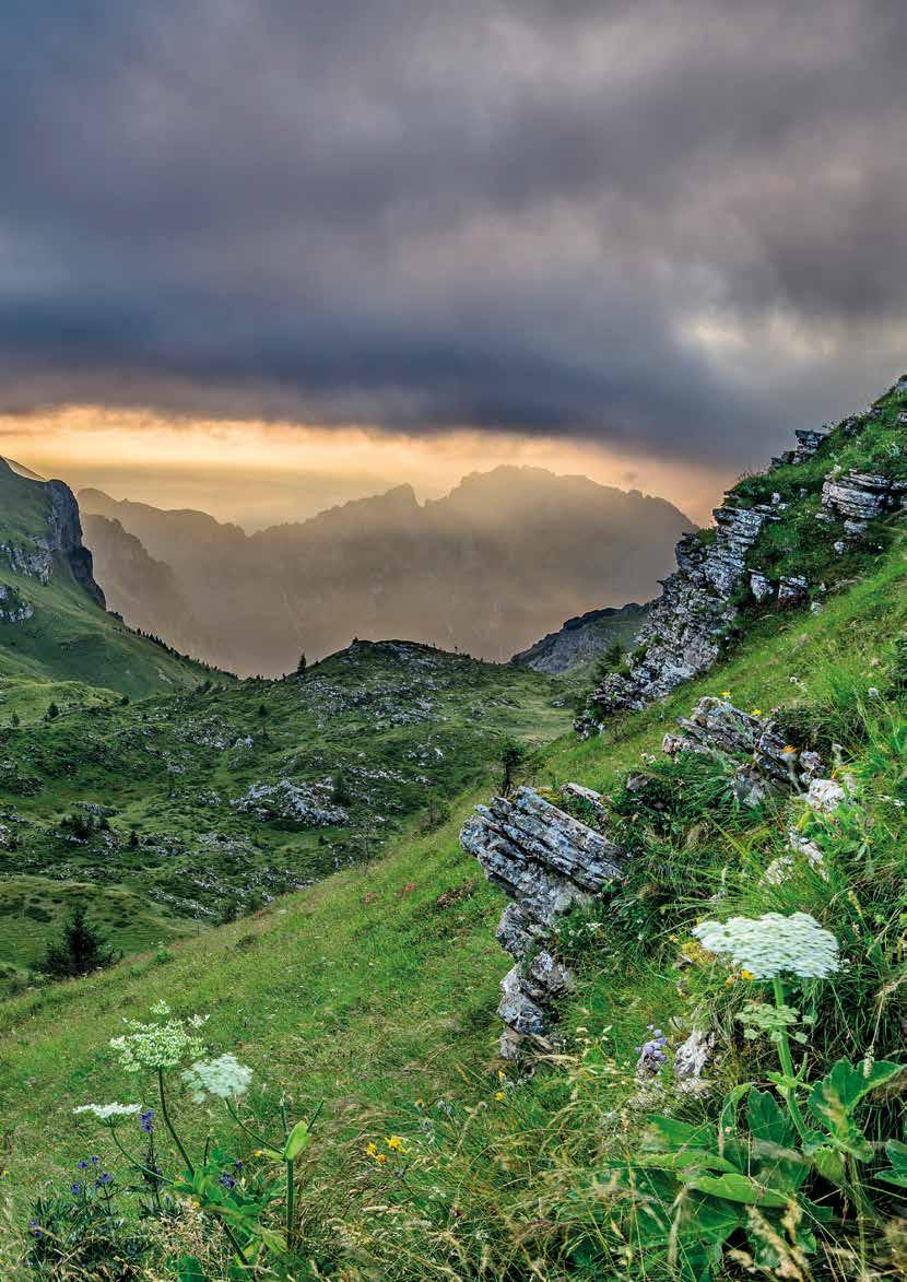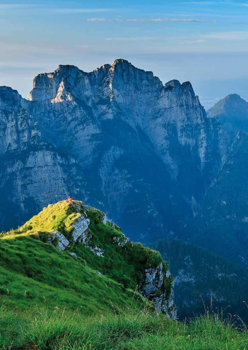 Bis zum möglichen Abstieg zur Forcella Scarnia ist das Gelände nicht weniger eindrucksvoll als gestern, etwas weniger anhaltend schwierig, dafür mit einer heikleren Einzelstelle, einer kurzen schuttbedeckten, abfallenden Felsplatte in steilem Schrofengelände. Die zweite Hälfte der Etappe ist Blumen riechen und Aussicht genießen angesagt. Es geht über die „Teufelspiazza“ und das Pietenakar mit seinen tausend Farben. Im Frühsommer ist es ein Blumenwunder. Irgendwann, nach sieben oder acht Stunden, bummeln wir in einen letzten grünen Sattel hinauf und sehen aufs Dach des Rifugio Dal Piaz hinab. Das Abendessen können wir fast schon riechen. Unsere letzte Hüttennacht steht bevor. Kann das sein? Nur noch ein Tag bis Feltre? Ein langer, langer Abstieg auf einer alten Militärstraße, dann Forstwege, schließlich Dorfsträßchen, Vorgärten, Mofa-Geknatter, Bratenduft und dann die Ankunft in Feltre: 20.000 Einwohner, eine alte Burg, eine große Brauerei und durchaus städtisches Flair. Gewiss werden wir uns fühlen wie aus einer anderen Welt kommend, einer besonderen Welt, steil und einsam, bella e brutta. ❚