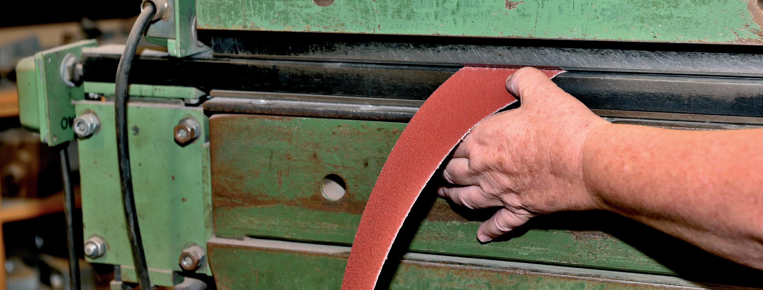 Schoenmaker blijf bij je leest. Dat credo zou je eigenlijk wel op de producent van slijp- en polijstschijven en verhandelaar van schuurpapier en schuurlinnen kunnen plakken. De veelal oude(re) medewerkers werken al sinds jaar en dag met dezelfde machines en verrichten traditiegetrouw hetzelfde handwerk. Zo verlijmt een van de vrouwelijke medewerkers al tientallen jaren de vellen schuurpapier tot grotere lengtes. Met akelige precisie strijkt ze met een kwastje de lijm op de kantjes waarna de vellen onder een oudere pers definitief met elkaar worden verbonden. Het is repeterend monnikenwerk, maar de medewerkster doet het elke dag nog met plezier. “We hebben het verlijmen ook al volledig mechanisch gedaan, maar dat bleek uiteindelijk te omslachtig en kostte teveel tijd. Het gaat er uiteindelijk om wat de beste kwaliteit biedt voor de klant”, zegt ze.