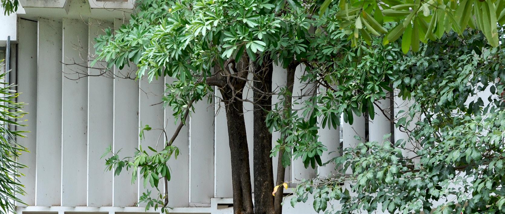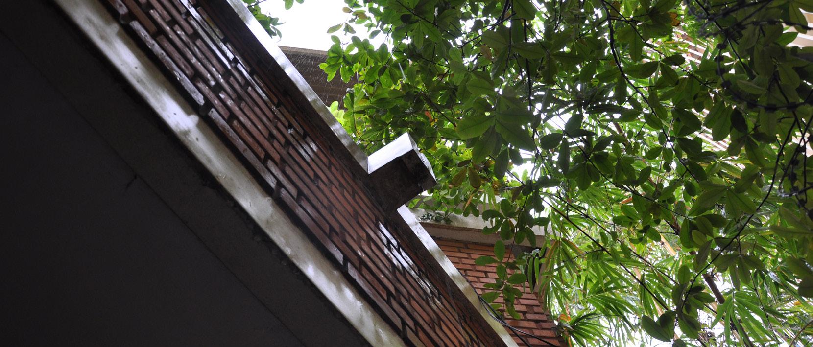 The main structure is reinforced concrete, with brick facing. The double-roof concrete shell is a regulated structure, waterproofed and covered with flat terracotta tiles on the outside and wood on the inside. The walls are finished with red facing brick. The interior is dominated by the sweep of the roof, which seems to float above the living room thanks to a horizontal band of glass around the perimeter. Vann Molyvann’s wife Trudy says the double roof is wide enough to walk between the two layers. As in many of Vann Molyvann’s buildings, Le Corbusier’s Modulor was used as a design tool. A 1.13 meter grid was used for the floor plans, the height of the balustrade is 83 centimeters (instead of the standard 100), and the height of the windows in the living room 226 centimeters. The roof inspired the Battambang Public Works Office designed in the late eighties by Sieng Sang Em, who was Vann Molyvann’s draughtsman in the sixties.
