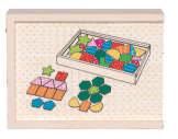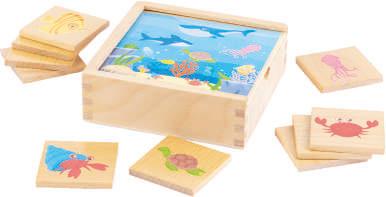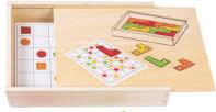20 fichas de madera con 10 pares de motivos. Incluye una práctica caja de madera para guardar las fichas.