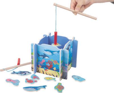 Estanque de pesca de colores con 14 figuras de madera y 2 cañas de pescar magnéticas. Las bases de las figuras llevan estampados números de puntuación. 20 piezas.