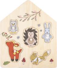 de animales de madera • E s timu l a de for m a lúdic a l a des tre z a y el re c ono c imiento de for m a s • Juguete de en c ajar pie z a s de mader a • In cluye 1 t a blero de ba se y 5 pie z a s de mader a