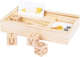 Cubos con letras Incluye caja de madera, 8 cubos con letras y 30 tarjetas en inglés.