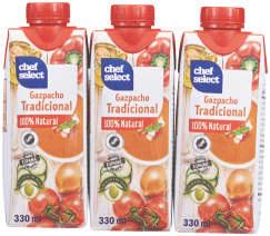 gazpachos y salmorejos Ingredientes 100% naturales. ¡Fáciles, rápidos y deliciosos! Chef S e lec t ® Gazpacho tradicional • Con ac eite de oliva . 3 x 330 ml (2 ,01 €/l) 1.99 /pack 3 Pack 3 Con má s pan y ac eite de oliva v irgen ex tr a . Por su sabor Por su textura Desde el jueves 11 de mayo F · C/BAL/CEU/ML · 19/2023 6