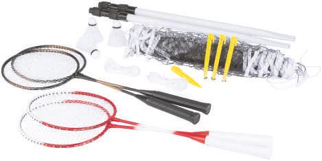 Equipo completo para 4 jugadores: 4 raquetas, 3 volantes, 1 red, 4 cintas tensoras, 4 anclajes y 2 barras telescópicas.