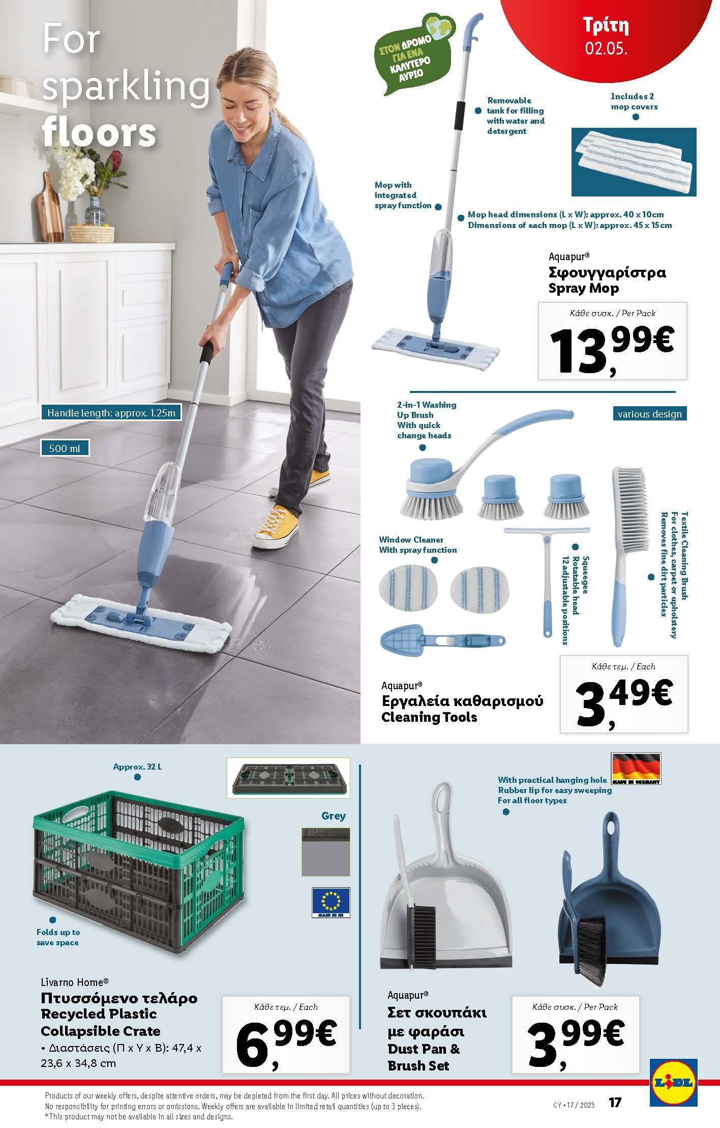 κλειστά, εκτός από τα Lidl Ορμήδειας & Κοκκινοτριμιθιάς, στα οποία οι προσφορές θα ισχύουν από 01.05. Τα παραπάνω προϊόντα, παρά τις προσεγμένες παραγγελίες, ενδέχεται να εξαντληθούν από την πρώτη μέρα. Όλες οι τιμές χωρίς το ντεκόρ. Καμία ευθύνη για τυπογραφικά λάθη ή παραλείψεις. Τα προϊόντα εβδομαδιαίας προσφοράς διατίθενται σε περιορισμένες ποσότητες για λιανική πώληση (έως 3 τεμάχια). * Το συγκεκριμένο προϊόν πιθανώς να μην είναι διαθέσιμο σε όλα τα μεγέθη και σχέδια. lidl.com.cy CY • 17 / 2023 12