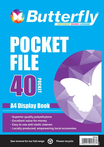 BUTTERFLY - DISPLAY BOOKS TREELINE - A4 FILING POCKETS FLIP FILE - DISPLAY BOOKS Key Code Description Qty A BS14740800 40Mic 100 Pack B BS14740900 40Mic 10 Pack C BS14741100 80Mic 100 Pack D BS14741000 120Mic 50 Pack 25mm A B C D E F G H A B C D E Key Code Description Qty D EMBPF40 A4 40 Pocket Each E EMBPF50 A4 50 Pocket Each - EMBPFA3 A3 20 Pocket Each - EMBPFA2 A2 20 Pocket Each A B C A B C D Key Code Colour Qty E TIRB25MMP1 Pink Each F TIRB25MMV1 Violet Each G TIRB25MMB2 Blue Each H TIRB25MMG1 Green Each