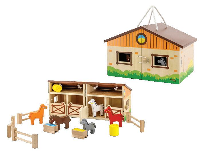 The horses are neighing. Time to let them out of the stable. This stable is well stocked with 5 horses, 4 fences, 2 haybales & 2 feeding troughs. The stable contains 4 horse stalls for you to rent out & earn stabling fees. Store the hay in the rafters. Age 3+.