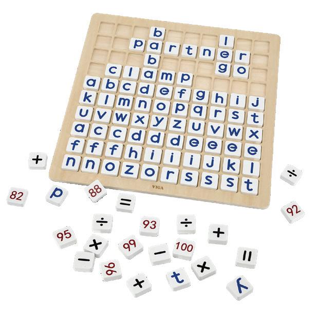 Create your own crossword puzzles. Features a wooden board slotted with a 10 x 10 square grid, 100 square wooden pieces printed with numbers on one side & lowercase letters & operation signs on the reverse. Age 3+.